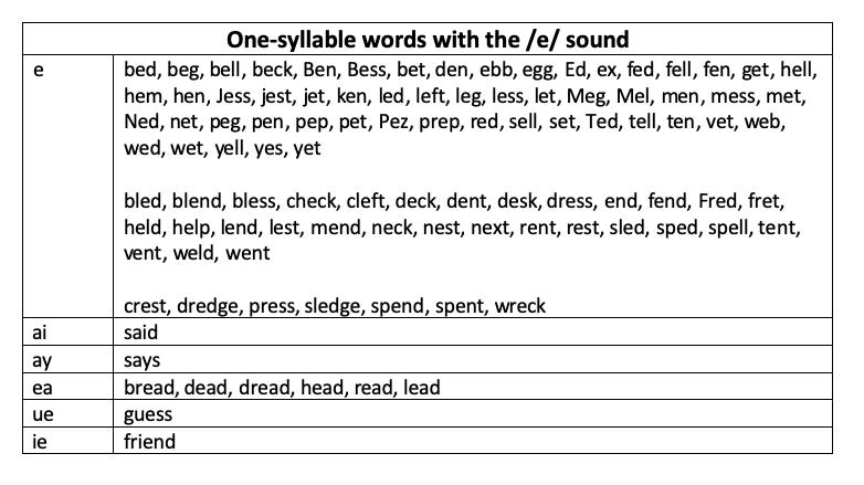 I am creating lists of one syllable words sorted by sound. This week, the sound is /e/, which is usually spelled ‘e’. However, the /e/ sound can also be spelled ‘ea’, ‘ai’, ay’, ‘ue’, and ‘ie’. If you can think of any spellings of the /e/ sound that I missed, put them in the comments section and I will add them to the table.